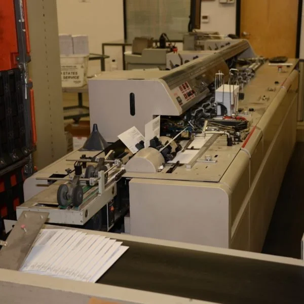8 Inserting Stations for nearly any size or amount of inserts, Multiple Page Folding and nesting, 3-Way Matching. Our inserters will insert specified material based on a 2D barcode printed on each piece.